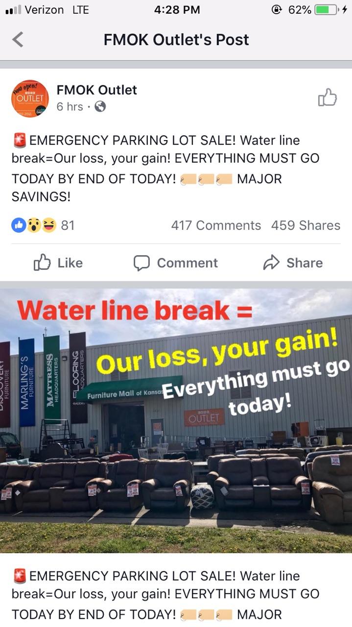 They ran a Facebook ad boosting it for $100.00. The turnout was pretty incredible, people just kept coming and buying furniture off the lot and off the floor.