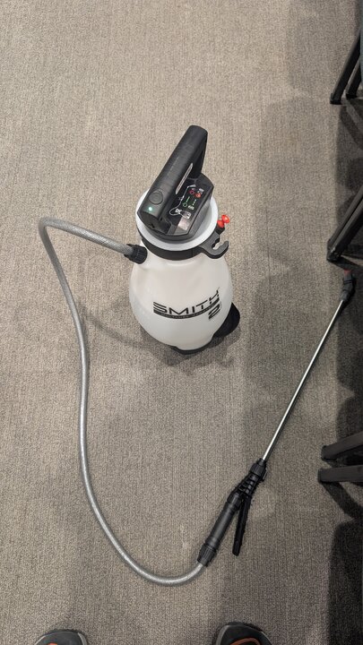 Electric sprayers are awesome when you find the right one 😉. Extra battery in the trucks too, though they last about a week with a full schedule. You can also cut the cheaper wands off and put a nice spray gun with some barb to 1/4npt connectors.