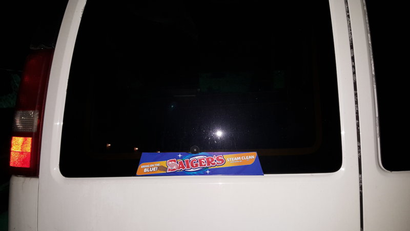 We did magnets painted to match the dark blue years ago. Then just a logo on the doors. Now just a company license plate up front.