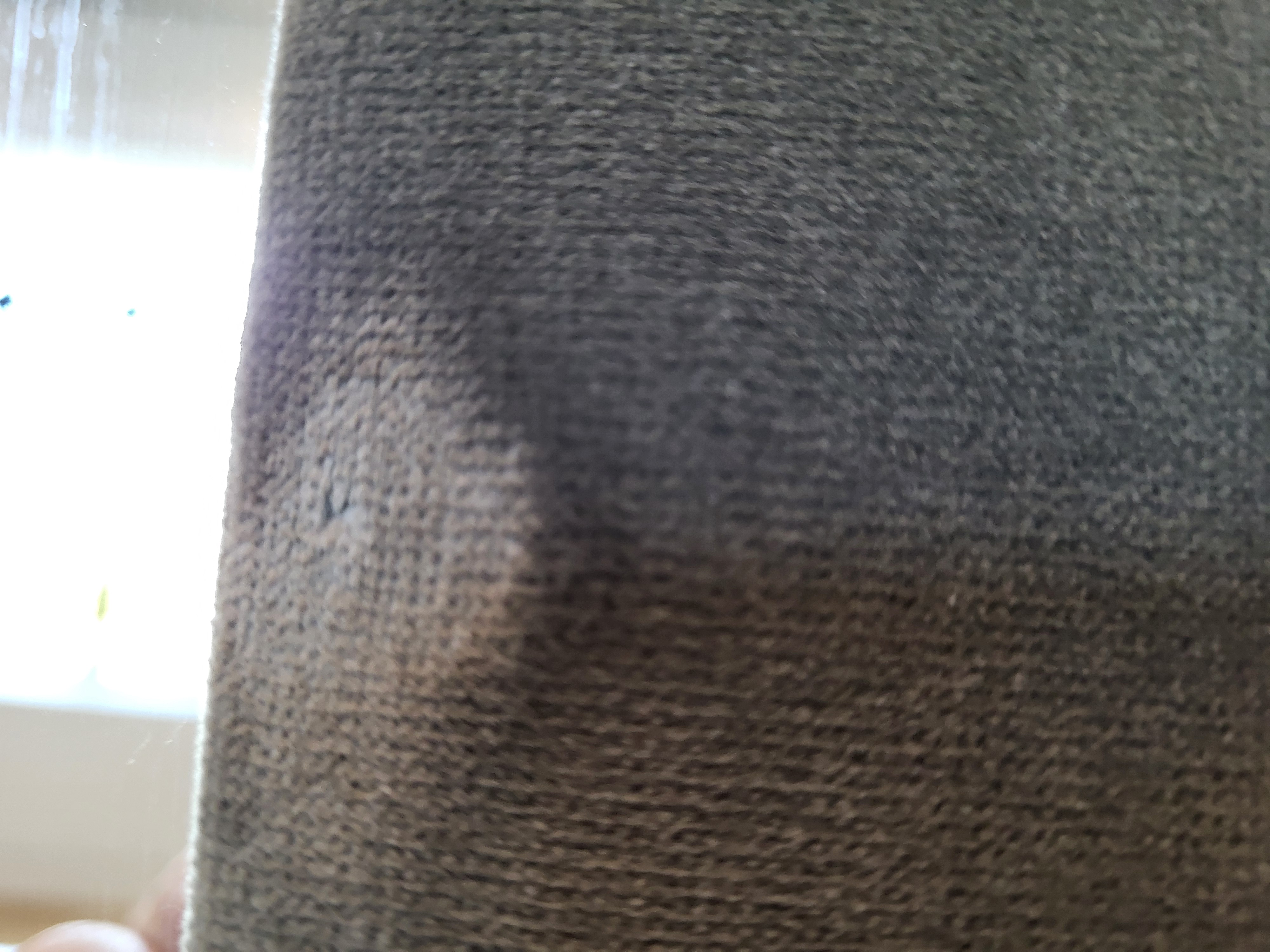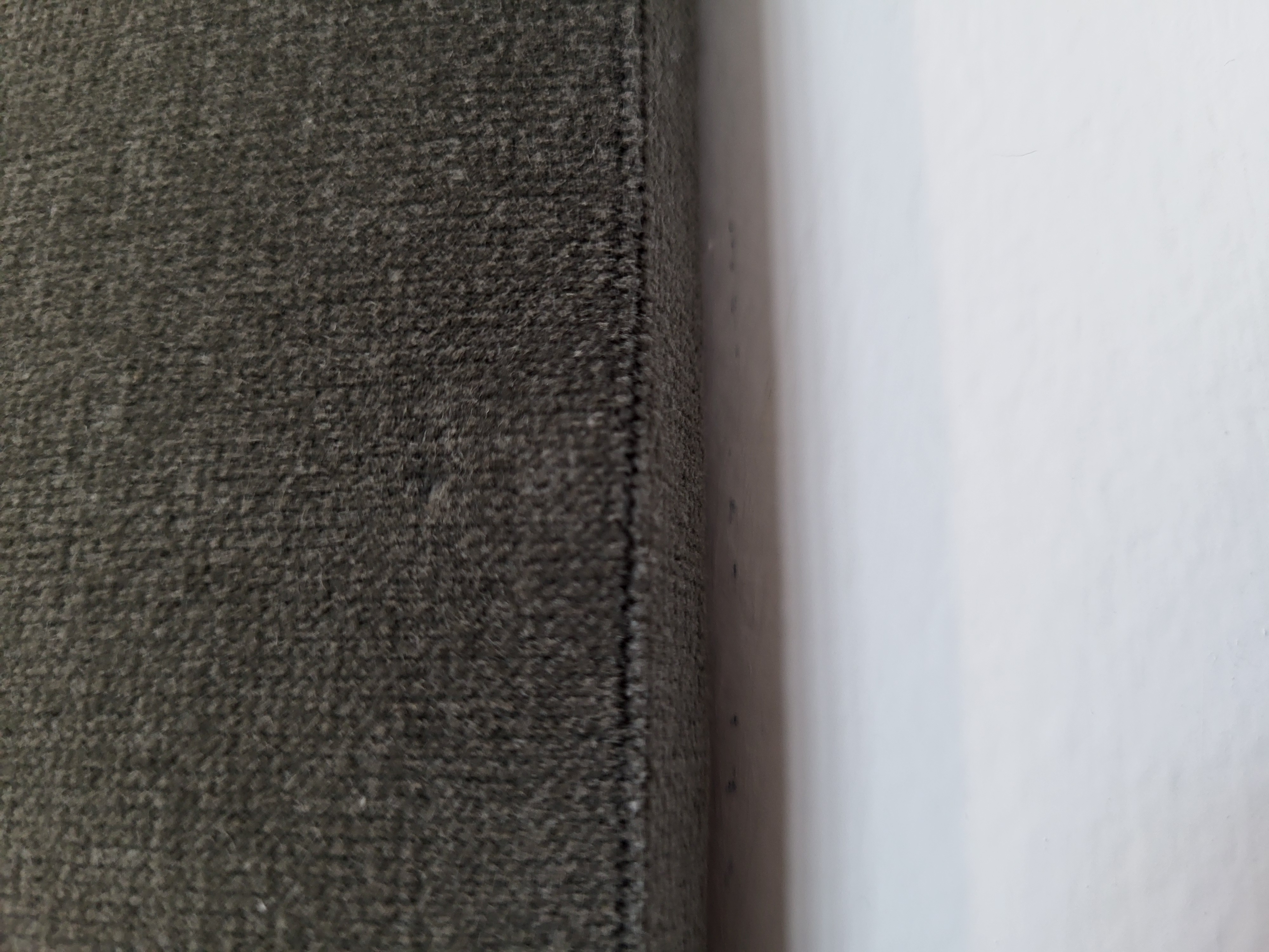 The installer claims that he didn't damage the fabric by nailing through it, as he does this all the time. He said that since the holes didn't really show, then they didn't exist. The claim is that we did it using an aggressive back and forth motion and it made the tiny hole visible. I went back and rewet and regroomed the fabric and worked the areas around the nail holes and it looks significantly better. There are still a few holes that kind of show, though I am not too worried as we have some before pictures that do show some nail holes if you know where to look. Also I have a piece of the fabric and every time I put a needle through it I take a tiny piece of the fabric with it.