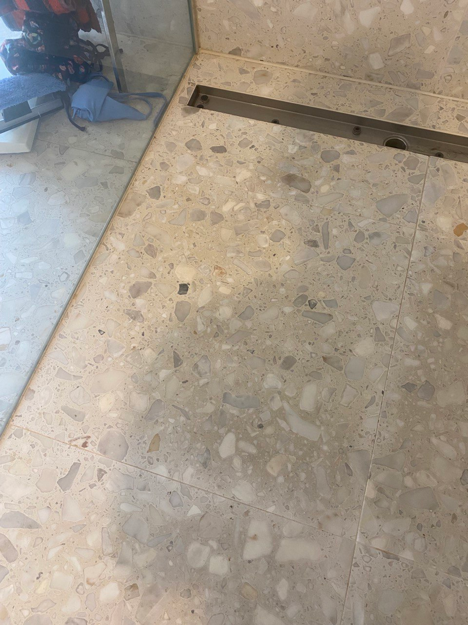 Follow my mystery writer's advice and if they want it smooth, which isn't the best idea for a shower floor, after it's dry, clean it real well with a high alkaline peroxide base cleaner and then restore the polish with DIP pads, and make sure you protect the glass from getting scratched