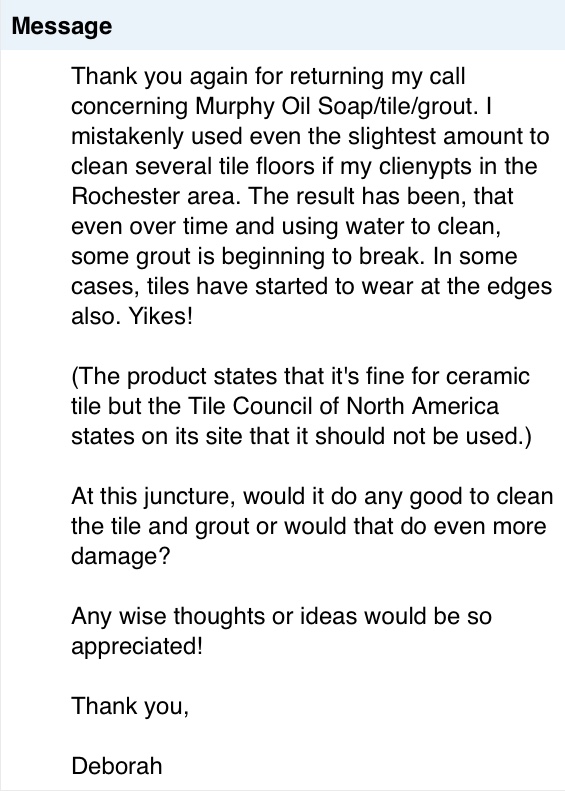 Customer has emailed stating that this Murphys 710 Soap over time is causing the grout to break (degrade) as well as the tile starting to wear at the edges. Wearing tile sounds impossible. I think theres a soft tile, maybe Duraceramic, with putty like grout. Could that be it and would this MOS be damaging the tile n grout?