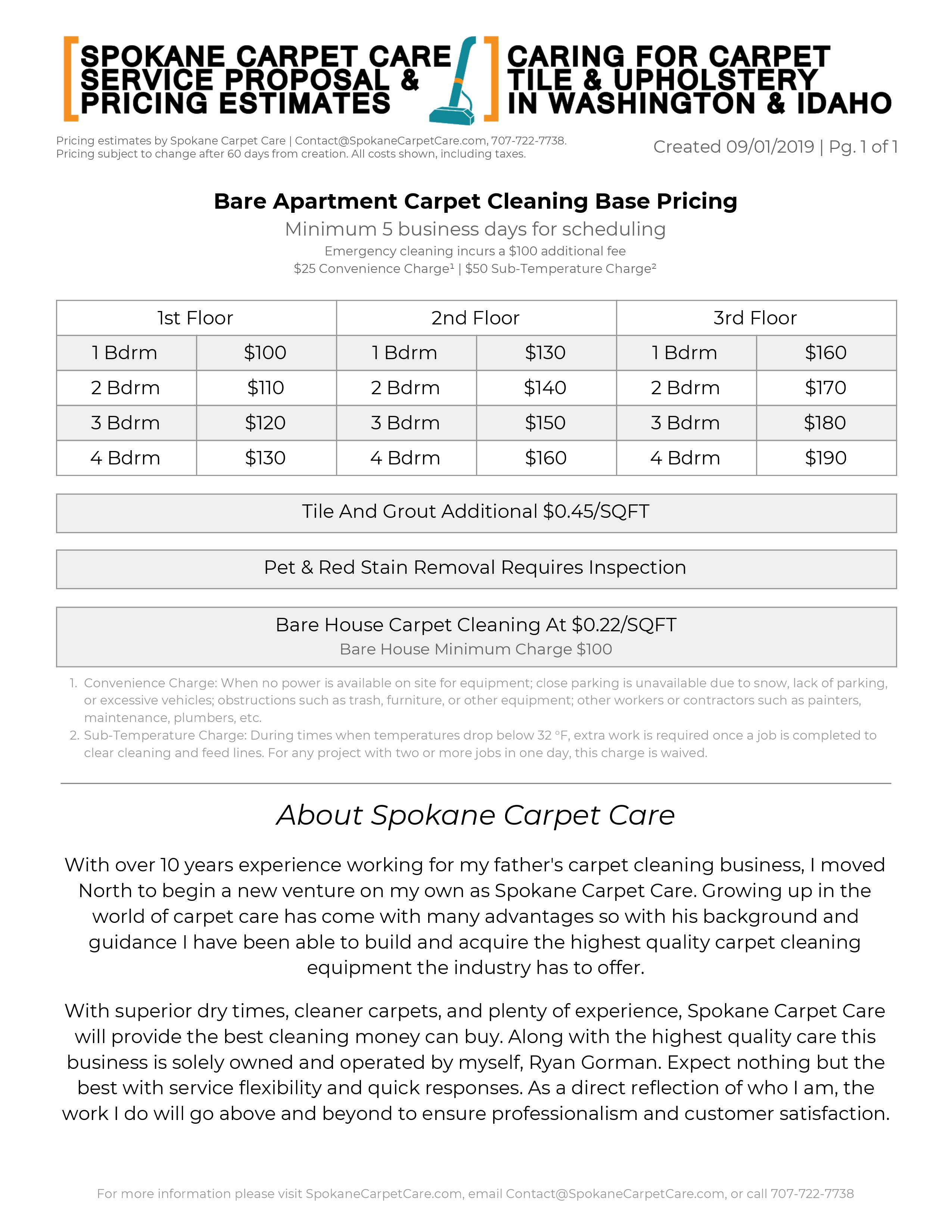 New here, and it was recommended to get some first hand opinions and feedback from all of you. I am building my business Spokane Carpet Care in Spokane, WA and have some new material to send out to commercial property managers. I attached my one page and would appreciate any opinions or feedback on the pricing, layout, design, wording, and anything else you might think of.