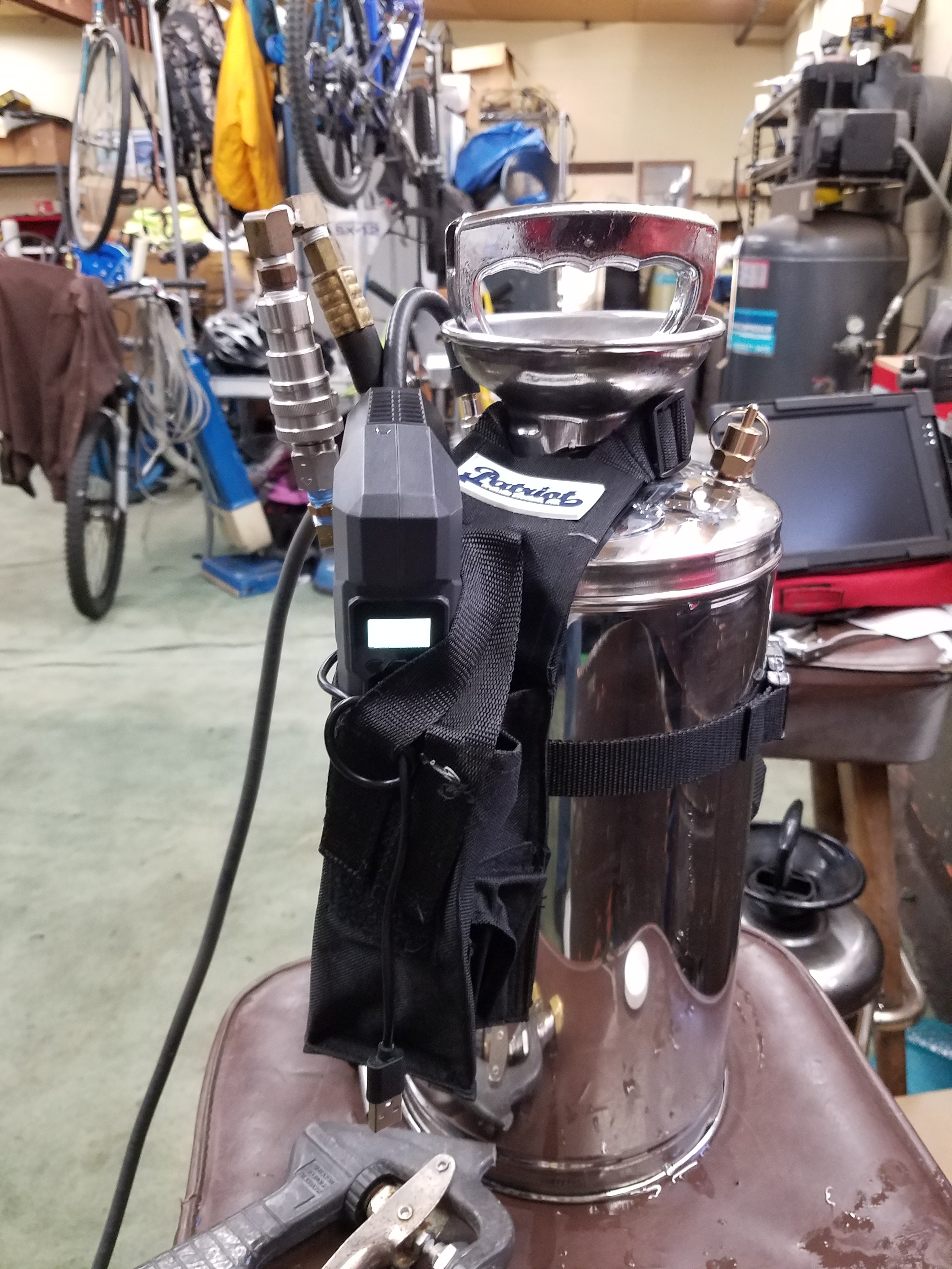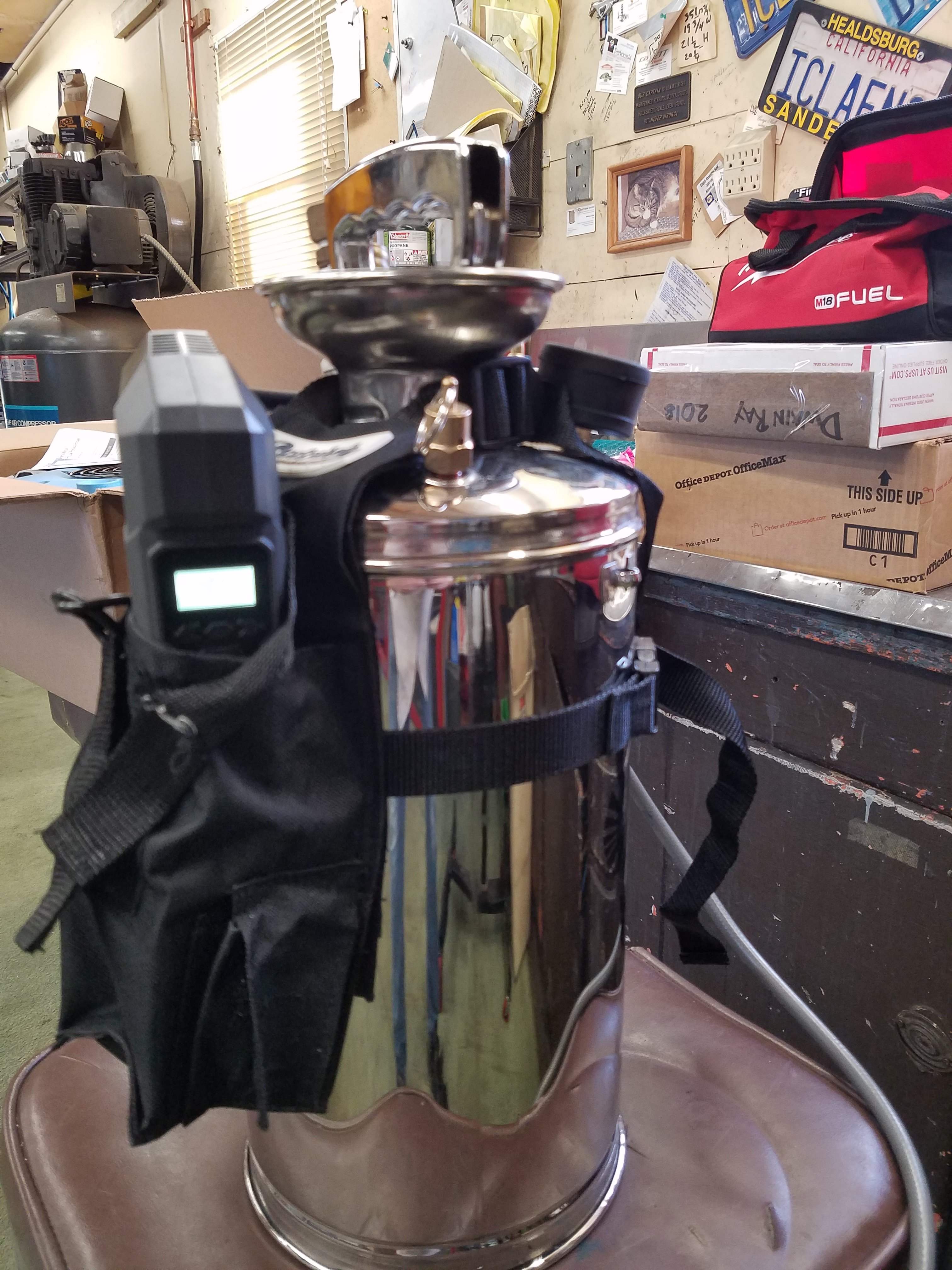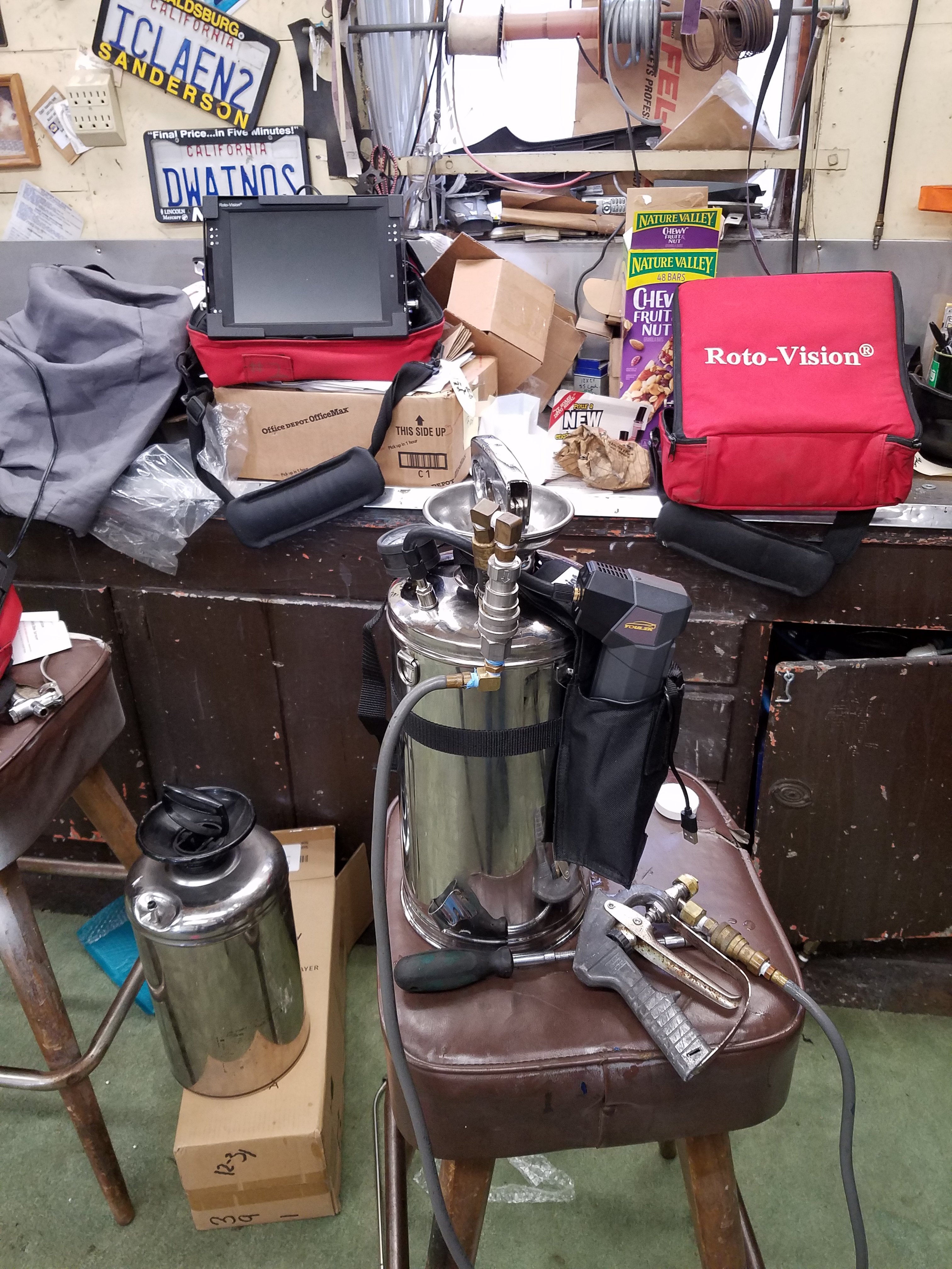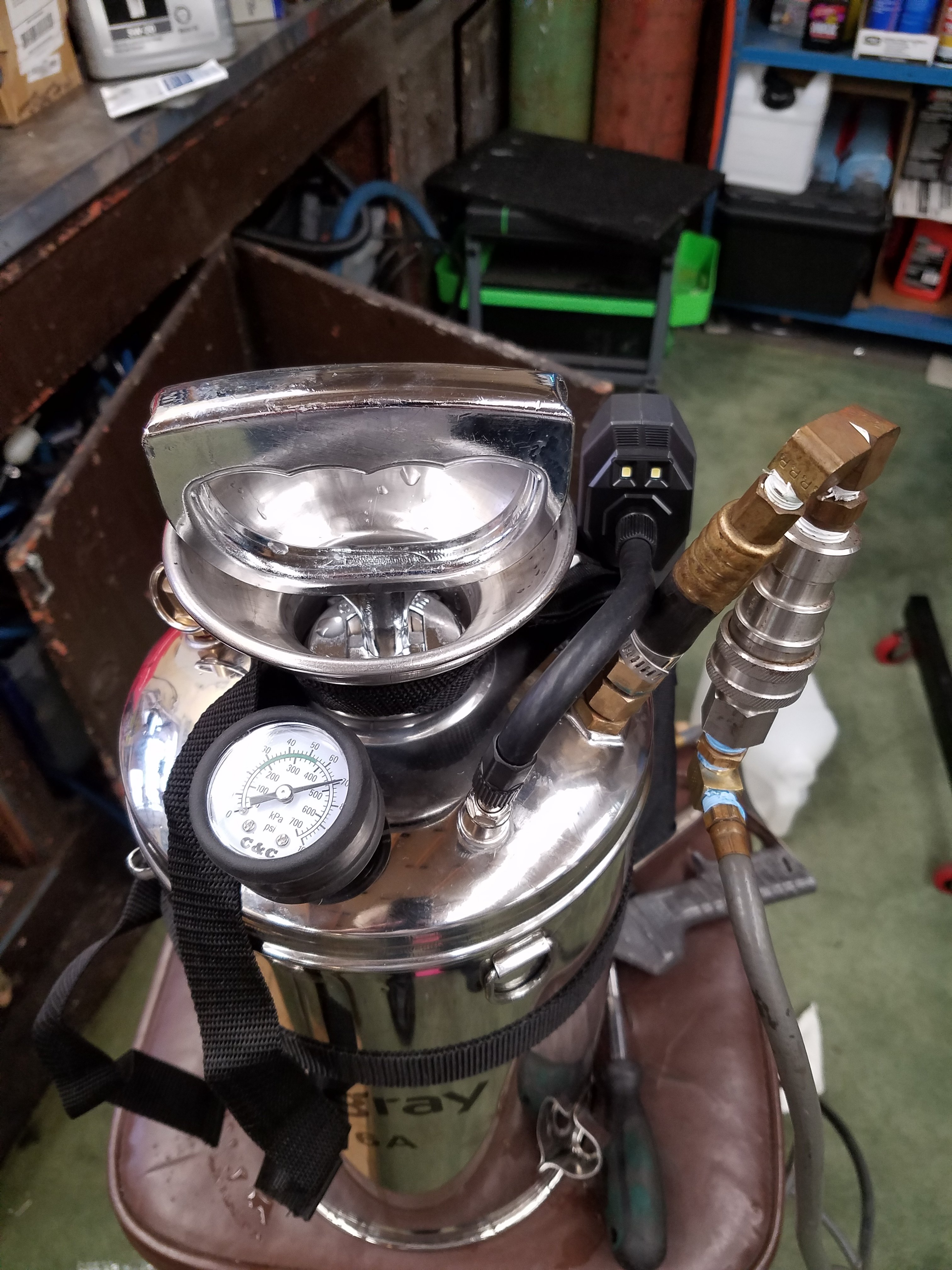 I have a reworked Pepsi container that's similar. Small portable air compressor that I can bring with me.If you're doing 2000 chairs you need one of these , i only did 350 chairs for a church with 2 of us 1 presprayed and brushed and the other cleaned this sprayer saved alot of time pumping up, you can't see it in the pictures but it has a 15' hose