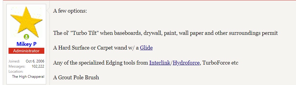 Quit cracking people's grout joints with high heat, quit turbo tilting and swelling their baseboards, regardless of them being cheap junk. It's not our place to **** up people's homes because we're too lazy to scrub and use a proper tool to do the edging.