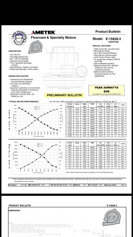 CFM testing is a lot more difficult to test for than waterlift / sealed suction. The easy way is to just measure the amp draw on the motor under operation (no hose, hose, with wand etc, your choice) then compare the amp draw to the data sheet (attached), read over to Lift or CFM and you are in the ballpark, probably within + or - 2% worse case. If the motors are in air parallel you are dead on, two motor CFM.(2 x 115 CFM= 230CFM) if in air series use only one motor CFM. Since I am at elevation, at 8000feet, the air density is way lower so I will have variations in flow, the motor speed will increase slight so the CFM will be higher.