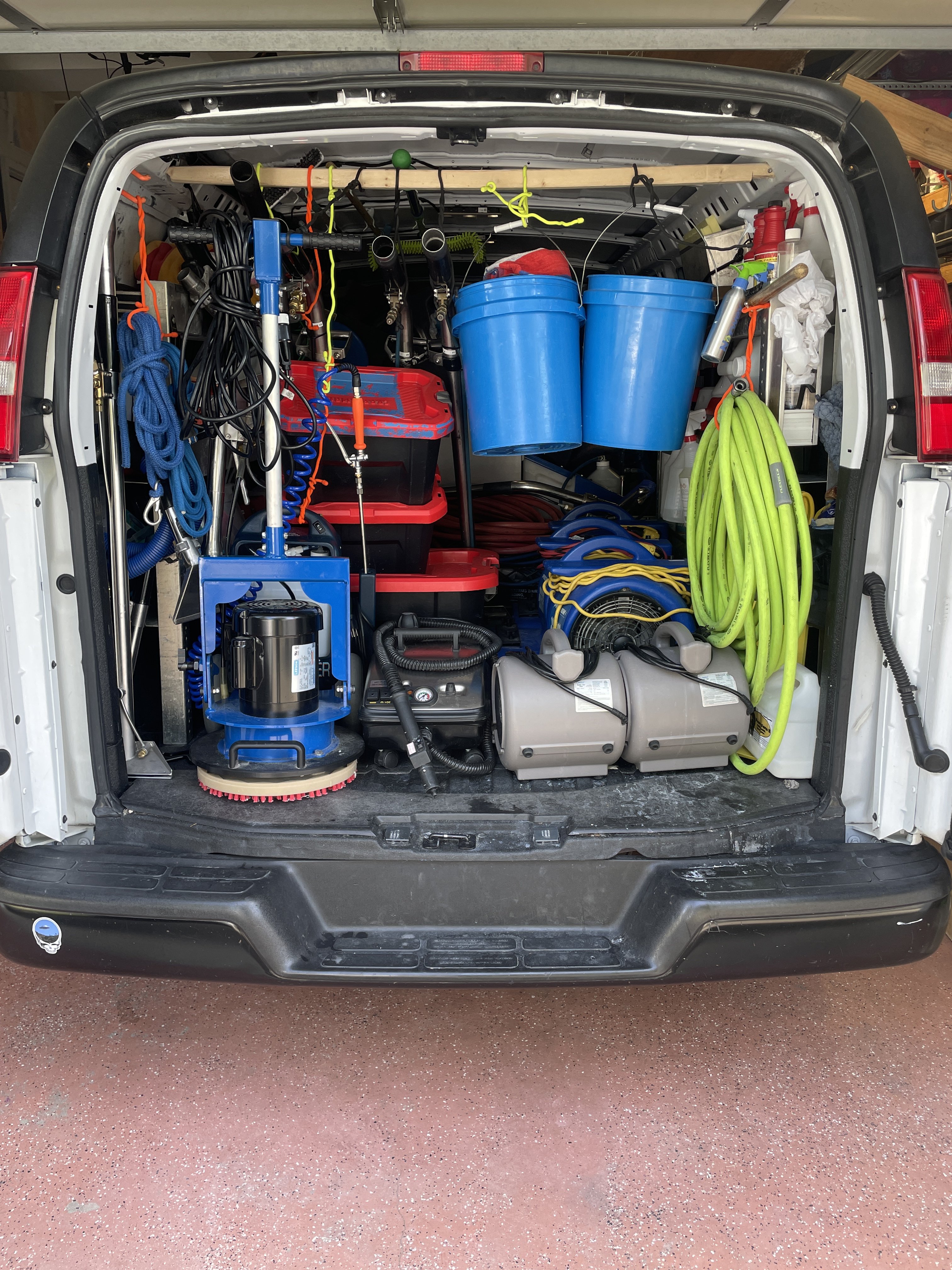 that wont fit in garage, and I get into some dicy sandy easements where my Chevy express has no problems. After I take down the buckets which come in on every job anyway, I can reach everything from outside the truck except my full size table and Tile tools which you cant see from this angle.A tall boy Transit?