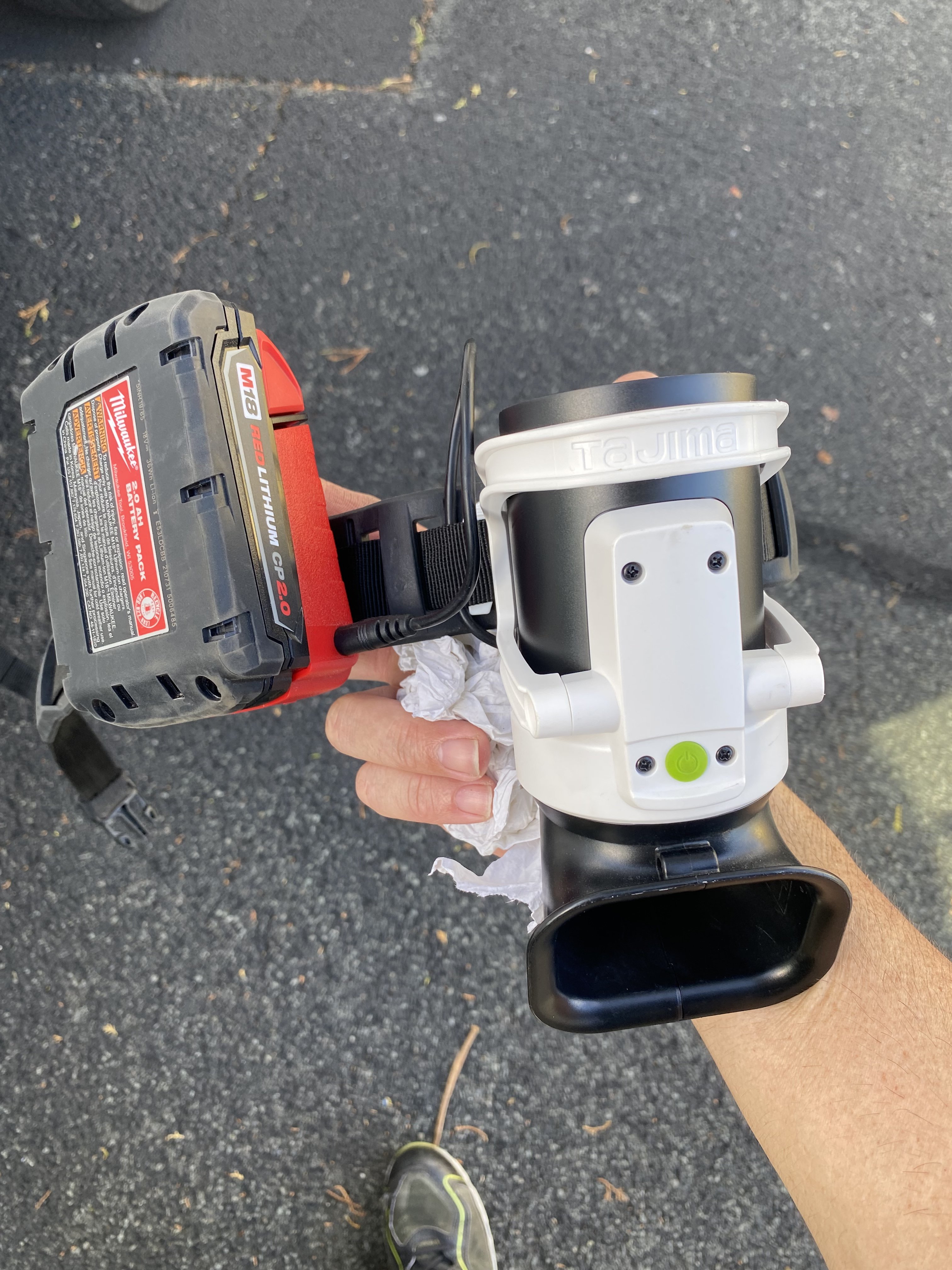 Tajima is the brand, comes from Japan.. I use a Milwaukee power adaptor because it has more battery capacity, able to switch out when it dies.. I was on outer island and I forgot the charger which is a small barrel type plug.. I just M18 tools so why not..