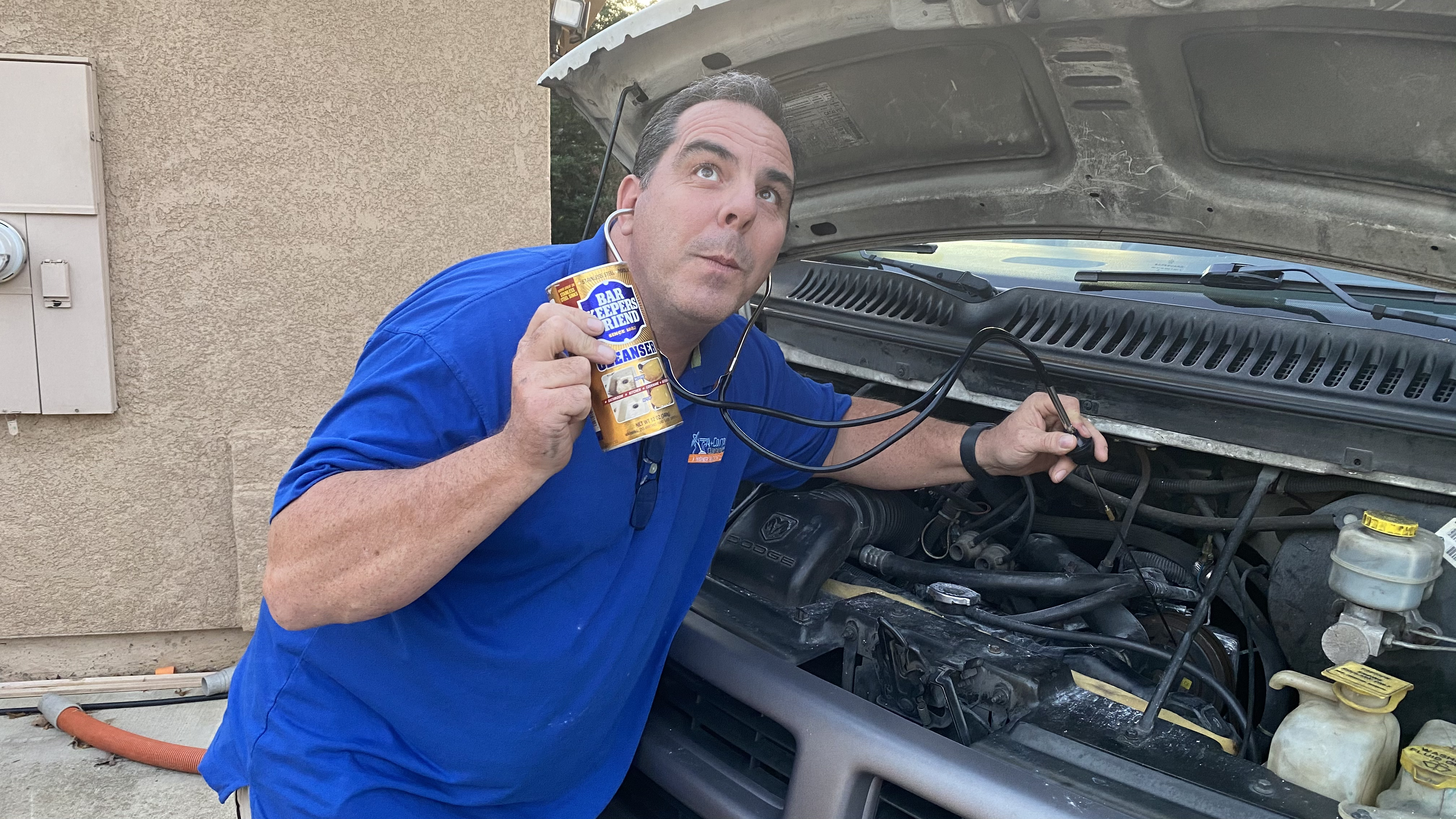 Does your mechanic clean carpet on the side? No, no he doesn't.So the lima bean special has been working hard. Every morning I give it a bump of Bar Keepers Friend to keep it from squeeking. I was sure it was the PTO pulley, but then I thought it was the idler arm pulley. Its really hard to tell because everything echoes under the hood. On second I think the squeek is coming from one spot, then it jumps to somewhere else.