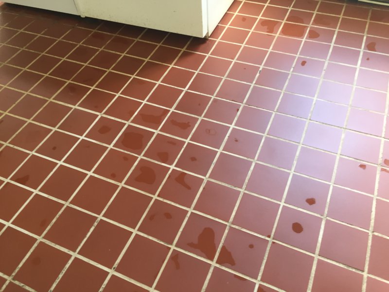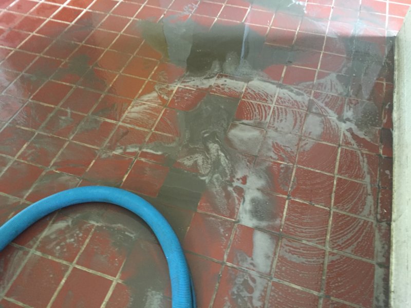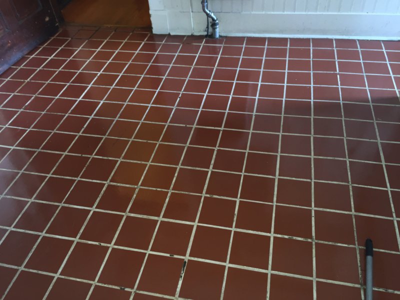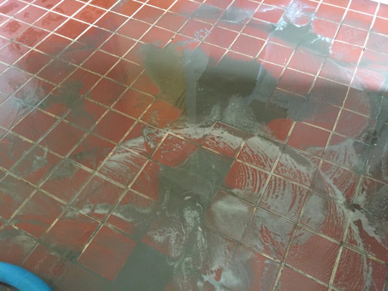 First off I failed to get a before pic of this tile & grout floor (many years of multiple wax uses) I looked it up today and this building was built in 1876 however I'm not sure if the tile was original or not (I'm sure it wasn't). Zep's industrial degreaser, BoneSaw Stripper 175 with grit brush "many" circular patterns performed. Then dry and Cobb's Ultraseal.